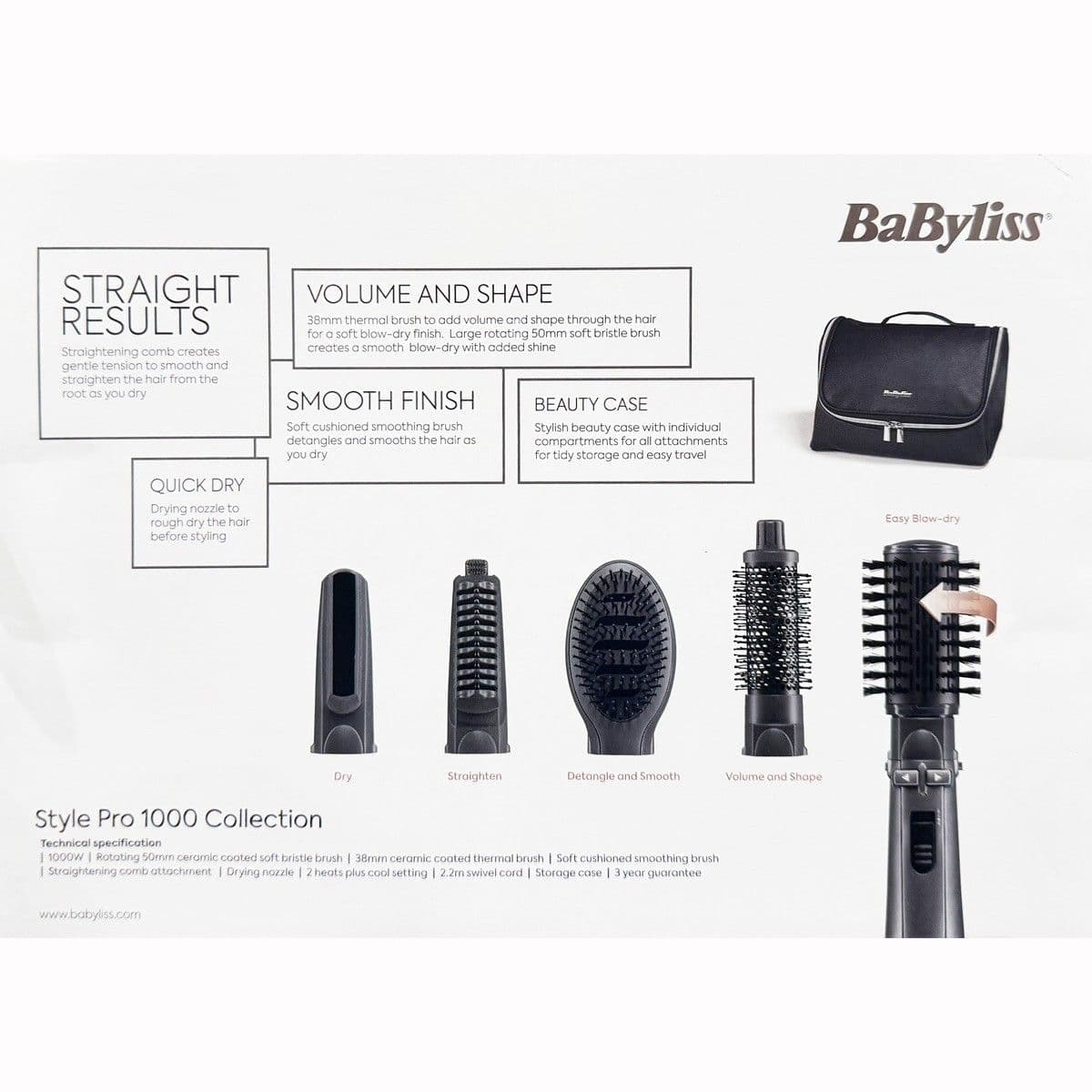 BaByliss Style Pro 1000 Collection offers professional hair styling at home with 1000W power, five versatile attachments, frizz-control, and a travel-friendly case for drying, smoothing, straightening, and volumising.